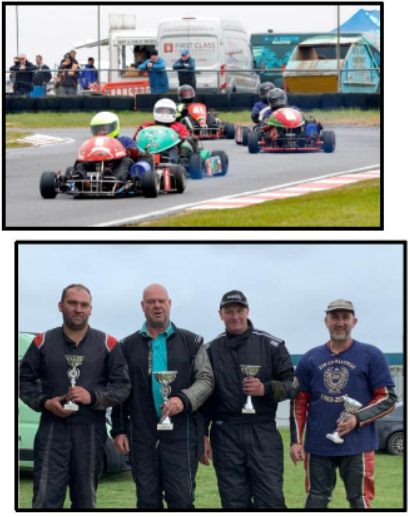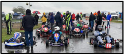 Heat 1 saw Woodward lead the chasing pack into the first corner. Out of it on a very slippery track saw quite a few taking avoiding actions, as it appeared T. Bury and Fowler had a little tête-à-tête shall we say! As they completed the first lap it was D. Bury 1st followed by Henry, Perkins, L. Sifleet, A. Sifleet and Woodward. D. Bury gave a masterclass in ‘racing in the wet’ lapping drivers up to 6th place to win by a mile. Henry fell into the clutches of Perkins and both Sifleets. By lap 4 L. Sifleet was up to 2nd demoting Perkins who had his vision greatly impaired by a fogged up visor! On lap 7 A. Sifleet now donning his coveted ‘0’ plate and who could see, demoted Perkins further down the field to claim 3rd. 1st D. Bury, 2nd L. Sifleet, 3rd, A. Sifleet, 4th Perkins, 5th Henry and our budding Novice Rawden 6th who’d made up 10 places during the race.
