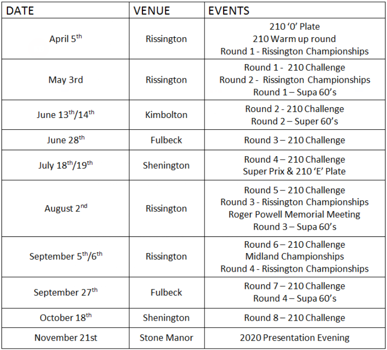 NB: Two day meetings have yet to have a format agreed i.e. whether we race on both days or practice all day Saturday and race on the Sunday. The hosting clubs have permits for both days so it has to be advertised as such.