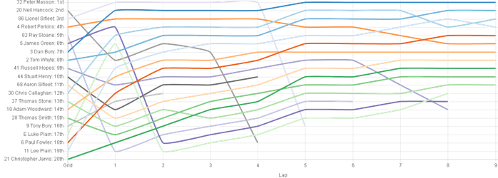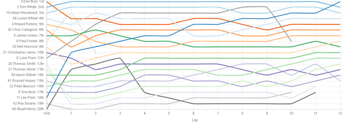 One could say a race full of trials and tribulations. L. Sifleet led for the first 4 laps until mechanical gremlins set it on lap 5 he made a quick pit stop but retired the following lap. This handed the lead to D. Bury whose life wasn’t made easy by Callaghan and Whyte. Green lying in 4th shot into the scenery like a bullet leaving a gun after a coming together with Luke Plain, both managing to restart, eventually finishing towards the rear of the field. Lee Plain and Fowler worked their way through the field from 18th and 19th to add to the excitement on the last lap. Sloane had unfortunately overcooked it at the end of the back straight and came to a halt just before Parc Ferme. D. Bury was now leading a charging pack of Whyte, Callaghan, Lee Plain and Fowler, and headed straight for Sloane. With Lee Plain on the grass and some miraculous manoeuvring especially from Callaghan the ‘oh S*** moment’ was avoided!