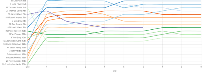 Fowler first time out since his forced sabbatical took the lead followed by Callaghan and Whyte, these chasing pair had a coming together at the end of the Back Straight as Whyte attempted to claim 2nd place. This left easy access for Luke Plain to take up 2nd spot and eventually take over at the front on lap 6. Woodward, L. Sifleet and D. Bury fought amongst themselves with Sifleet passing Woodward on lap 4. Woodward kept Bury behind him but it was a close call over the finish line with 0.05 separating them.
