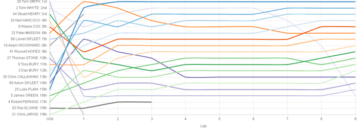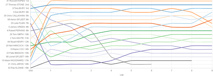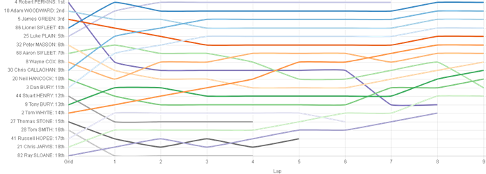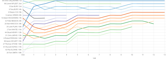 For the first time team Woodward hosted the front row and it was Woodward who left Perkins and Green standing. However the charging pair of L. Sifleet and Plain demoted him at Stratford hairpin. Stone realised it wasn’t a good idea to try and take a short cut through the Chicane but did recover. Plain took over at the front on lap 2 only to retire on lap 7 to hand the lead back to L. Sifleet. Lap 3 saw Callaghan pass Woodward around Wilkins to give chase to L. Sifleet.